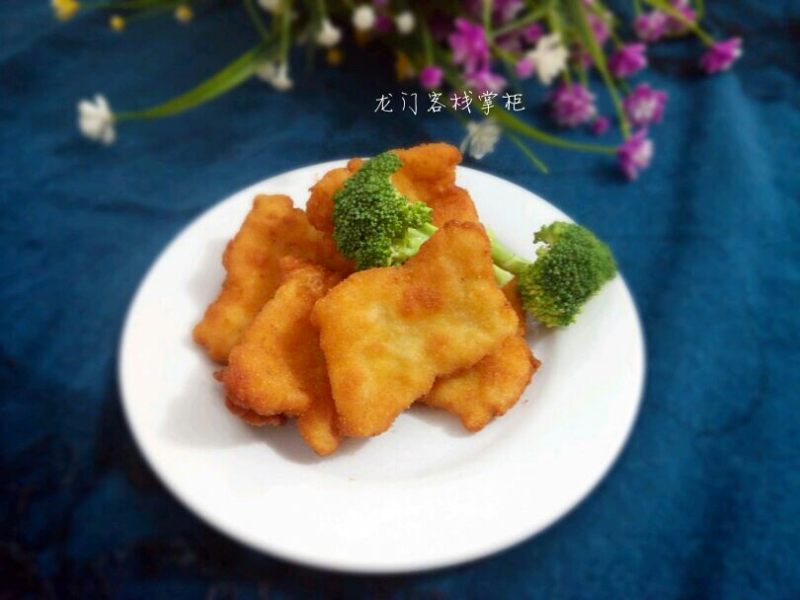 3:鱼片先沾上面粉,接着裹蛋液,最后沾上面包糠,放入热油锅,小火炸。