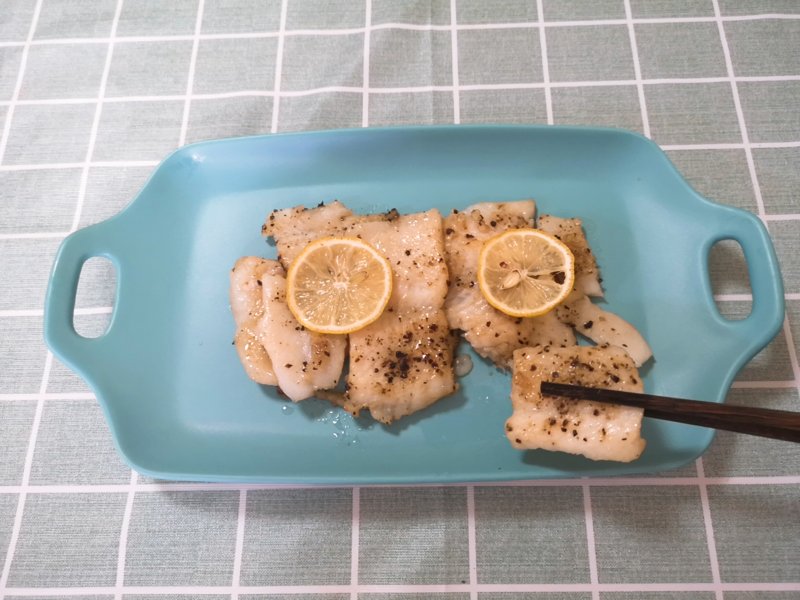 7:煎好后起锅装盘。最后放上柠檬片即可。