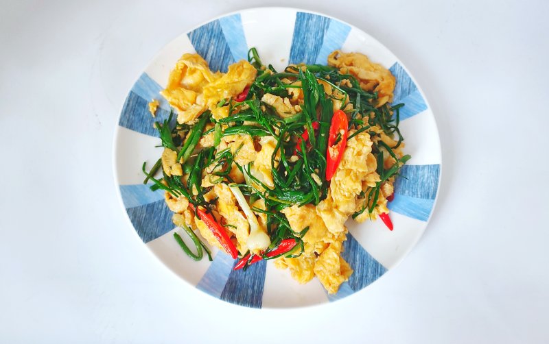 6:如图所示:锅里再次加入油,油烧热倒入辣椒炒一会儿,再倒入野蒜炒出香味。