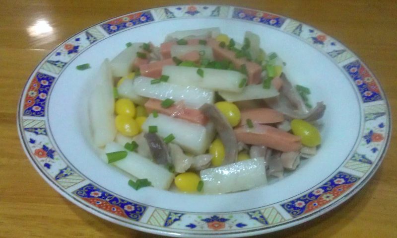 7:热锅冷油放入肚条和白果、姜片翻炒片刻,加入高汤或开水煮3-5分钟,加入火腿肠、鸡精、少量胡椒面、糖及盐,翻炒片刻后倒入山药条一起烩1-2分钟,旺火收汁后装盘撒上葱花。