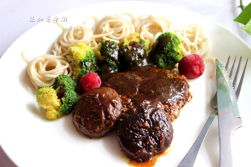 11:把面,牛排和蔬菜一起摆到盘子中,淋上黑胡椒汁即可。