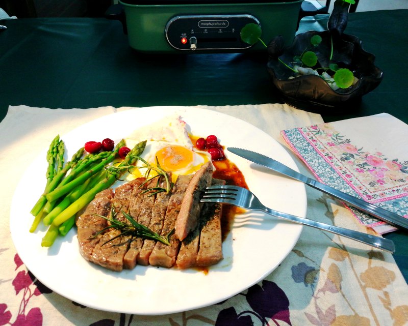 4:准备摩飞料理锅,开中段烧热,一边打入鸡蛋和放入蔓越莓鲜果,一边放入牛排煎,具体看你的牛排厚度和喜欢吃几分熟而定。
