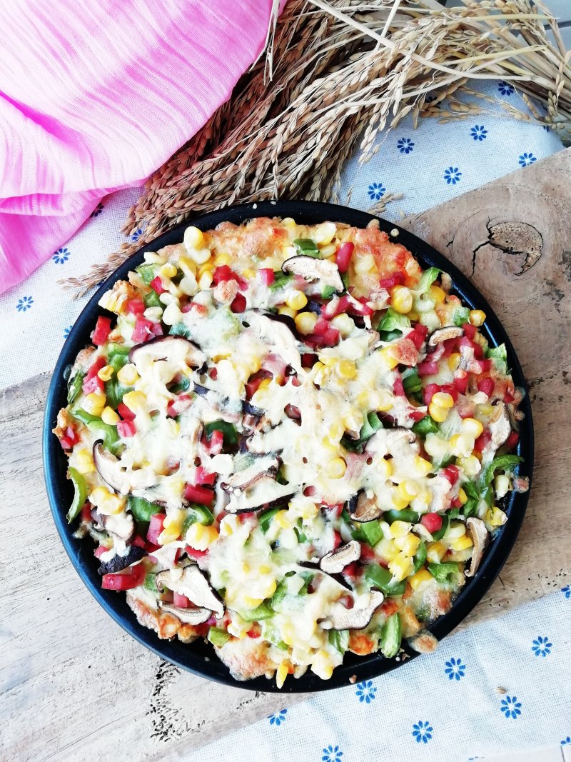 馒头100g;鸡蛋4个;香菇50g;玉米50g;青椒50g;马苏里拉芝士奶酪100g;
