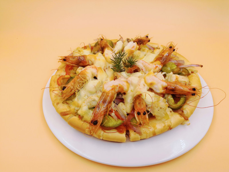 鸡胸肉半个;虾仁8个;洋葱丝50g;彩椒丝150g;披萨酱30g;