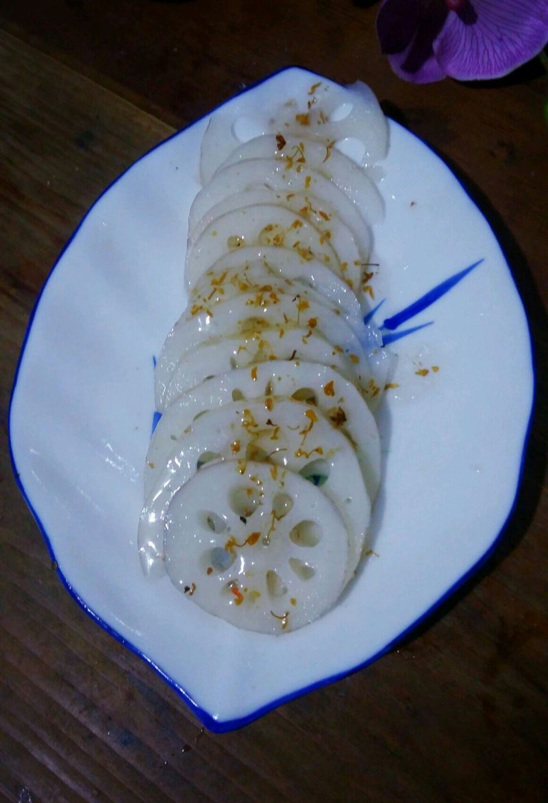 6:煮好后,将藕切片,摆盘,淋上糖桂花,美味的桂花糖藕就做好了~