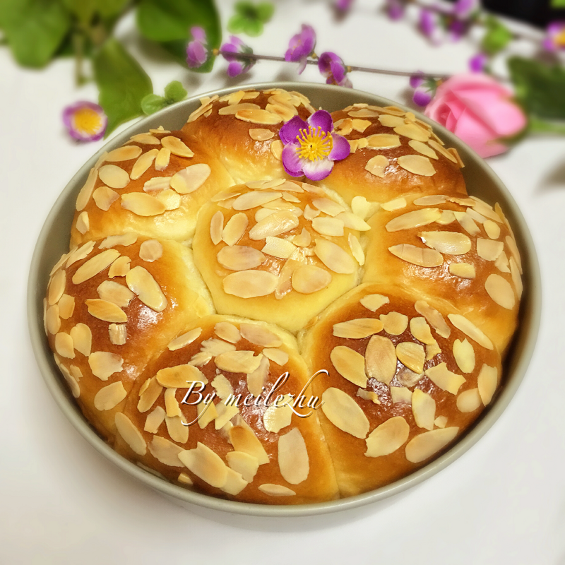 面团因为加入了马铃薯泥,所以会特别的粘手,整形时可以在手上抹少许食用油防粘;因为我是直接揉圆入模,所以省略了松弛的步骤;请根据自家烤箱的脾性调节温度;面粉的吸水性不同,可先预留10克水;清水可换成等量的牛奶;另外中间的面团比围边的面团稍微分量大点会比较美观。