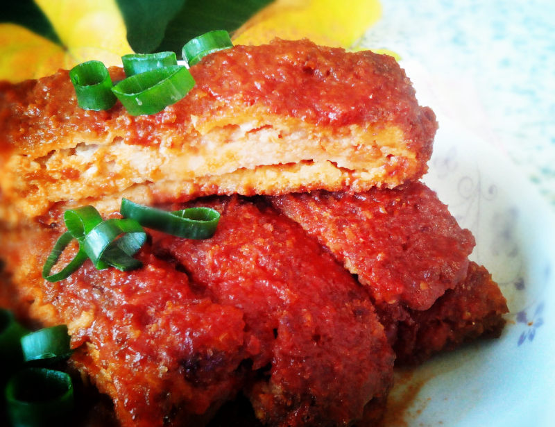炸的时候炸到猪排两面金黄色即可,不用担心不熟,因为后面还要烧制一下,炸到八分熟就行。具体的酱汁用量要根据你的肉排多少调整。烧的时间不宜太长,不然肉排就不脆了。这道菜被我折腾的着实复杂了,但胃口很是满足啊。嘻嘻。有时间你也来试试吧。