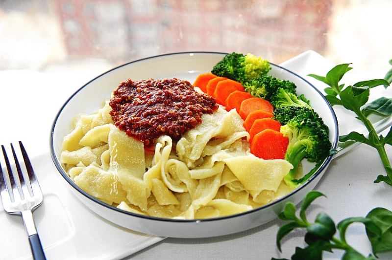 9:出锅装盘,码入胡萝卜片和西兰花,浇上自制辣椒酱就OK了。