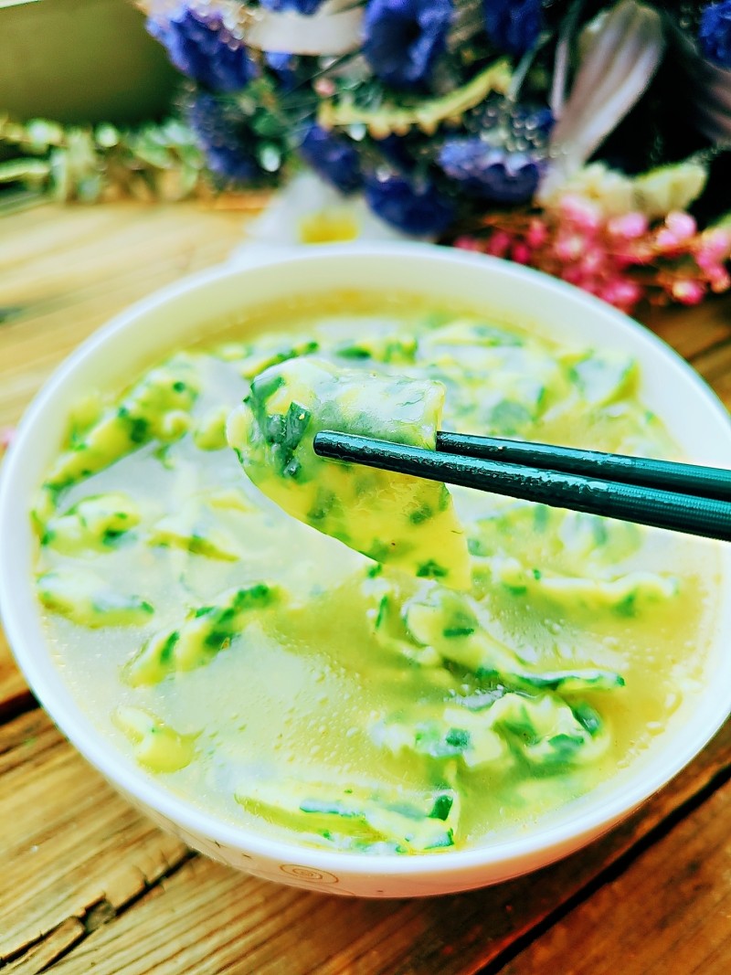 9:水开后,下入韭菜面片片煮熟,加盐、鸡精调味,淋上香油。
