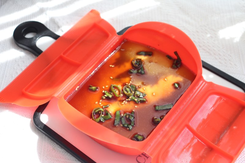 8:程序结束后,直接打开蒸烤箱,取出模具,把准备好的料汁淋到蒸好的蒸蛋上,我们的蒸蛋就做好了。