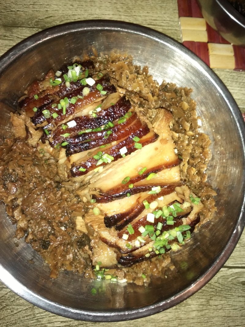 5:五花肉皮朝下顺序铺好,咸菜干加上少许老姜,花椒,大料,八角(喜欢一点点辣味口感的加一两个干辣椒)平铺在五花肉让上蒸锅整45~55分钟
