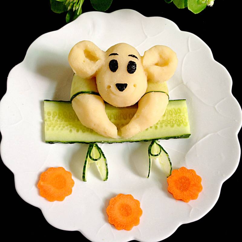 6:取个干净平盘,摆上一块厚点的青瓜片,再将土豆泥捏出卡通两只手臂,将两片薄青瓜片包住摆入盘中。