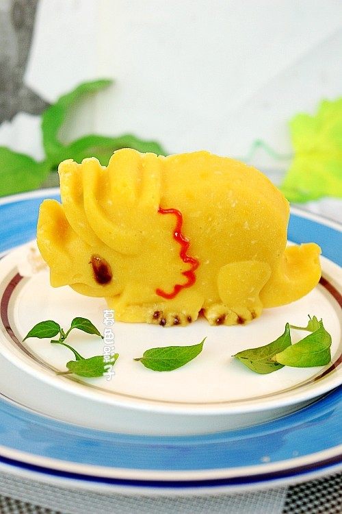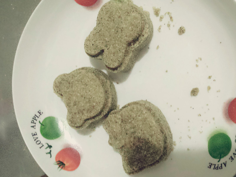 6:模具没有抹油、(宝贝很排斥异味)用硅胶刮刀装进模具、放在桌上震几下出气泡、盖上保鲜膜放温度低的地方成型、脱模画上眼睛等等就可以了