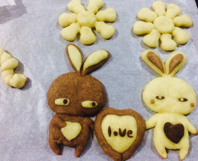 5:按版上铺上油纸,后面的步骤全部在油纸上进行,以免移动过程中变形。用自己喜欢的磨具做出造型,也可以用手捏出独特的造型,更可以让孩子们自己动手做!过程满满的都是爱!
