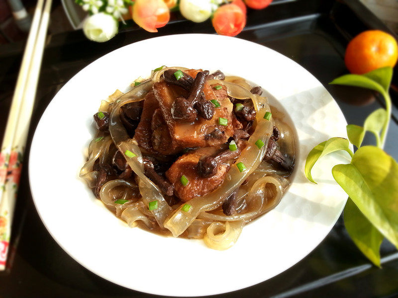 为了保留蘑菇的鲜味,所以要少用调料。蘑菇的营养丰富,浸泡蘑菇的水也不要浪费哟。我用的宽粉比较耐煮,也比较筋道。