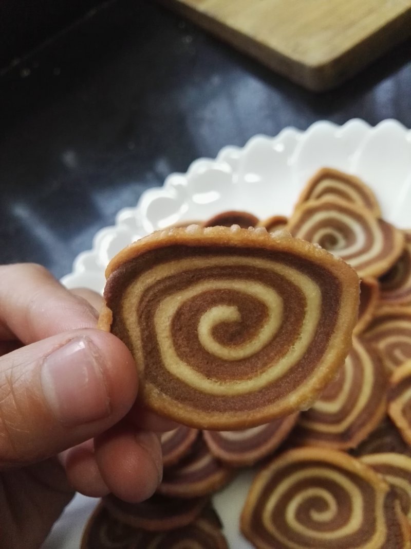 3:白色放下面,涂上一层水,盖上咖啡色。擀一下,卷起来。放冰箱冷冻至硬。之后切片,越薄越好。后面炸了脆。