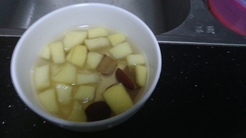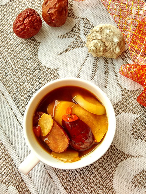 1:用料:生姜10克,苹果半个,大枣2颗,枸杞15毫升,红糖适量,水适量