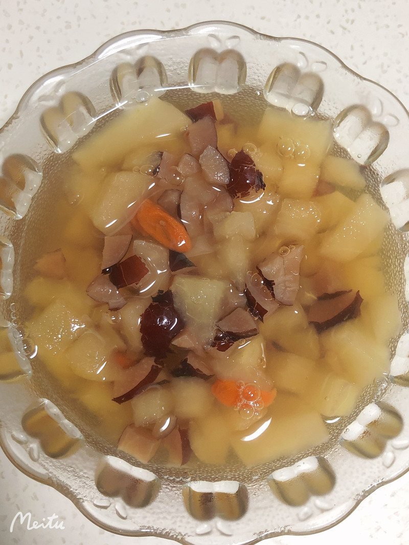 自己煮的话可以放点黑糖或是红糖进去,也可以加蜂蜜,苹果的维生素含量很高,红枣具有补气血的功效,苹果汤还具有醒酒的功效。