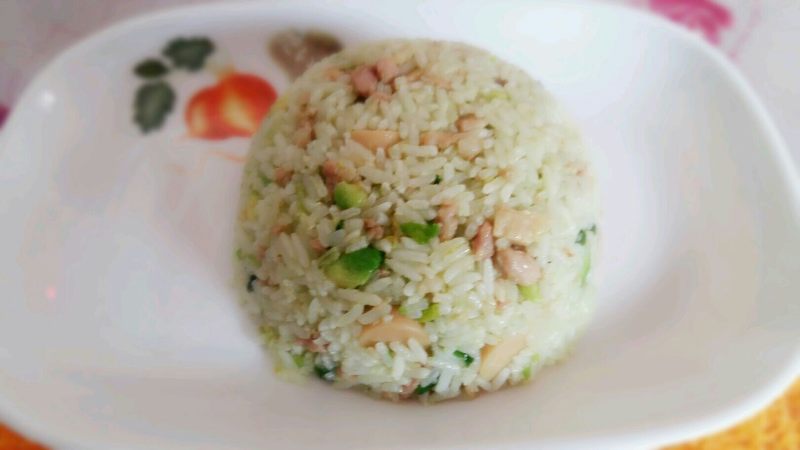 4:起油锅,下米饭炒,敲鸡蛋下去,炒一会儿就下葱花,下盐,再翻炒一会儿,下牛油果,继续翻炒。