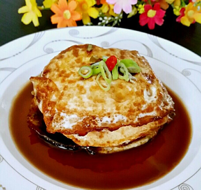 5:倒入之前调好的糖醋汁,再放入煎蛋焖几分钟即可。