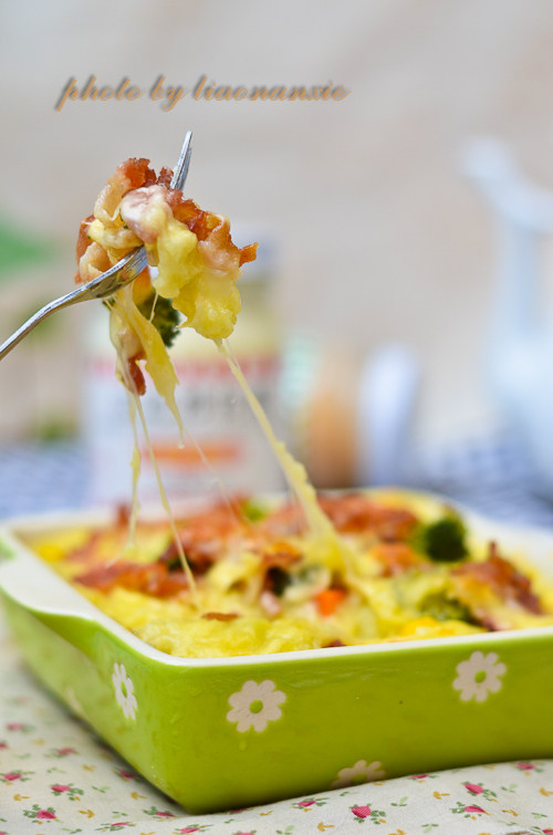 14:放进烤箱中层,上下火165度,20分钟,芝士融化并且表面稍微焦黄即可