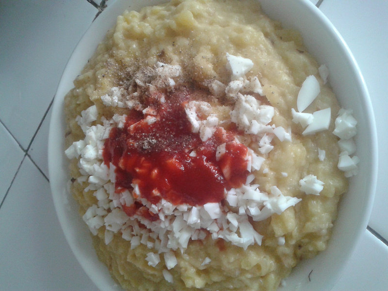 2:土豆煮熟不用弄成泥,小块状即可,撒黑胡椒、迷迭香、盐、糖。