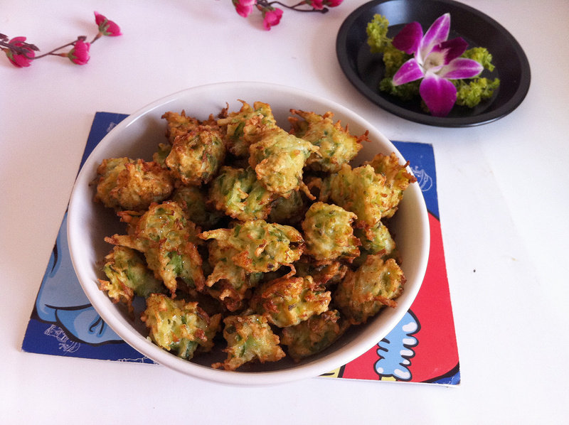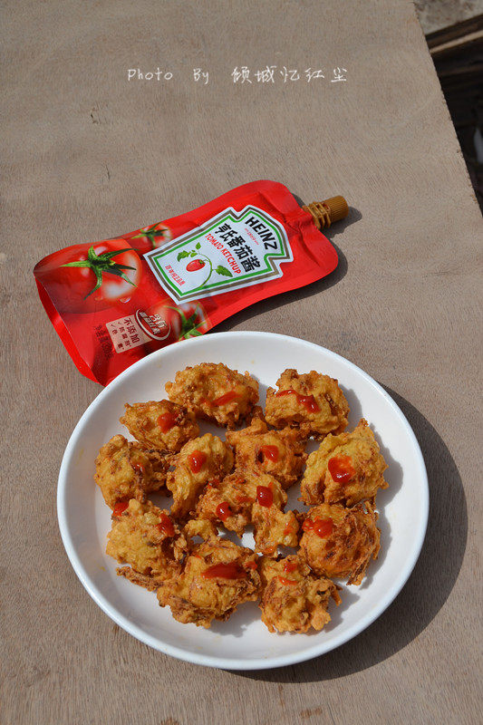 6:油烧热后,用手挤成丸子状下油锅炸至金黄后捞出控油即可。蘸番茄酱食用很好吃哈