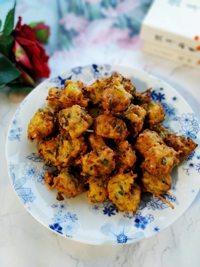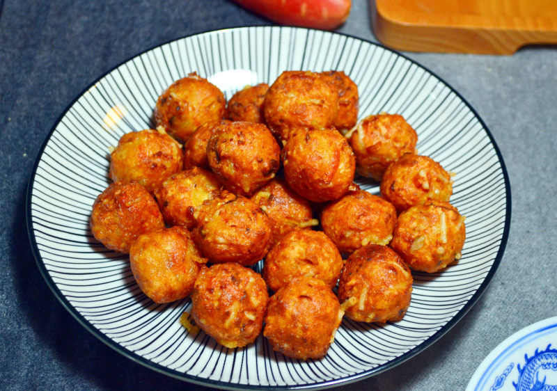 5:油烧热后,用手挤成丸子状下油锅炸至金黄后捞出控油即可