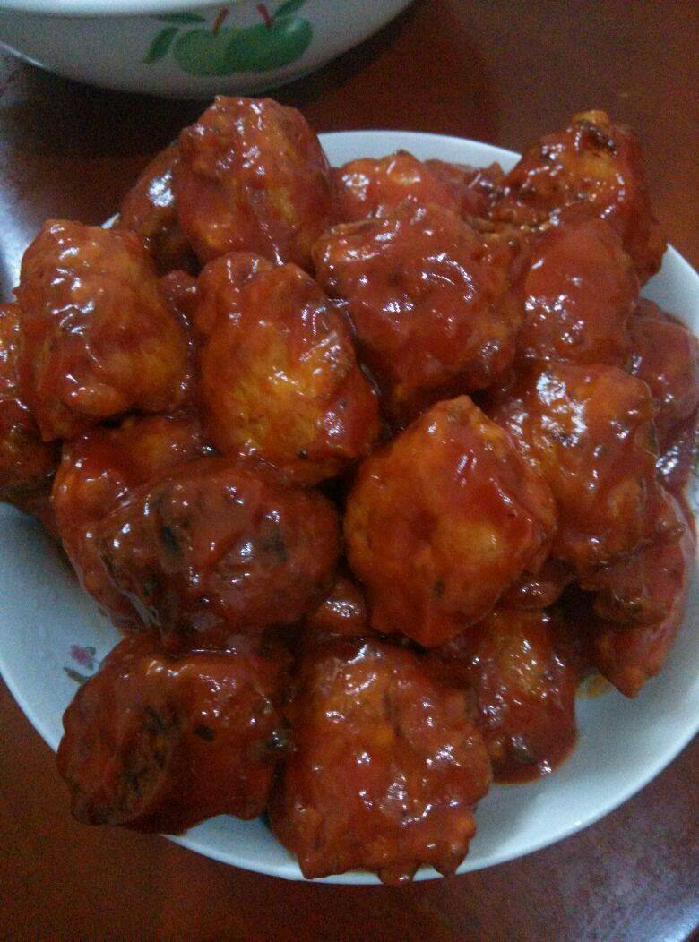 10:所有得丸子炸好后,锅子中加入番茄酱,倒入丸子,使之均匀得裹上番茄酱即可。