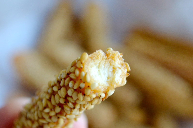 8:炸至芝麻条变胖,漂起来了,转中火炸至表面金黄酥脆即可。