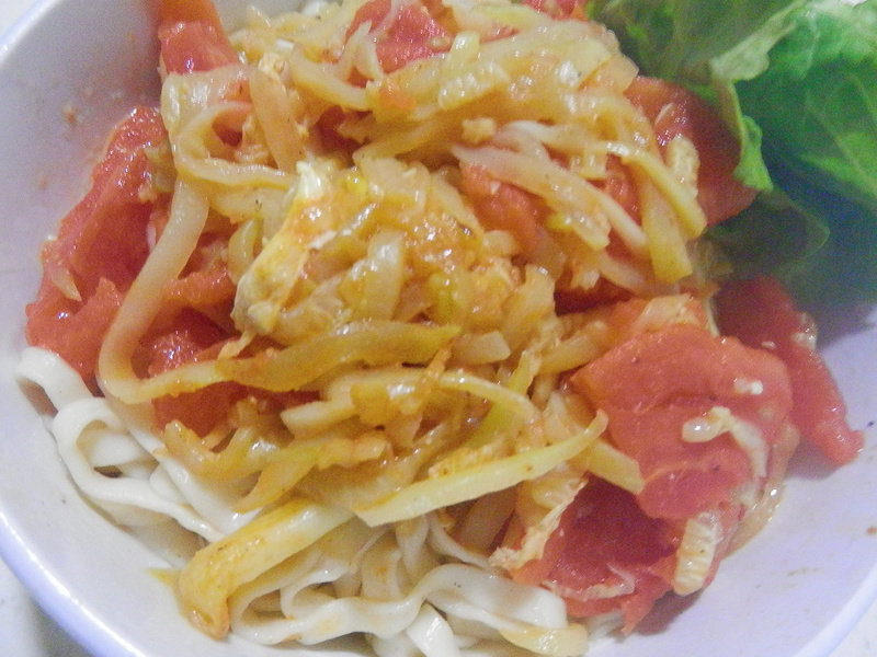 西红柿两个;鸡蛋两个;小瓜一个;葱一根;面条适量;