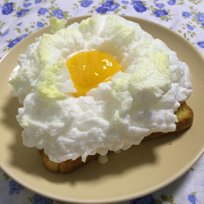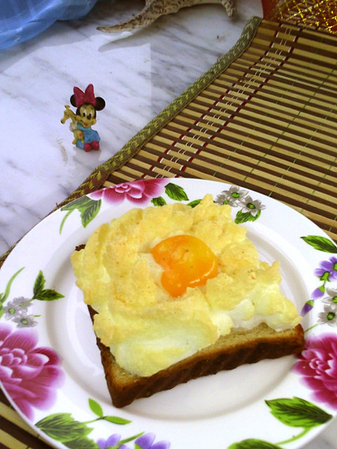 5:把蛋黄放到洞中,像不像云朵中的大太阳?