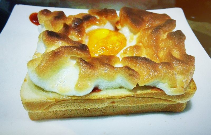 4:蛋黄放在一片吐司上,另一片吐司放上肉馅和韩国辣椒酱;