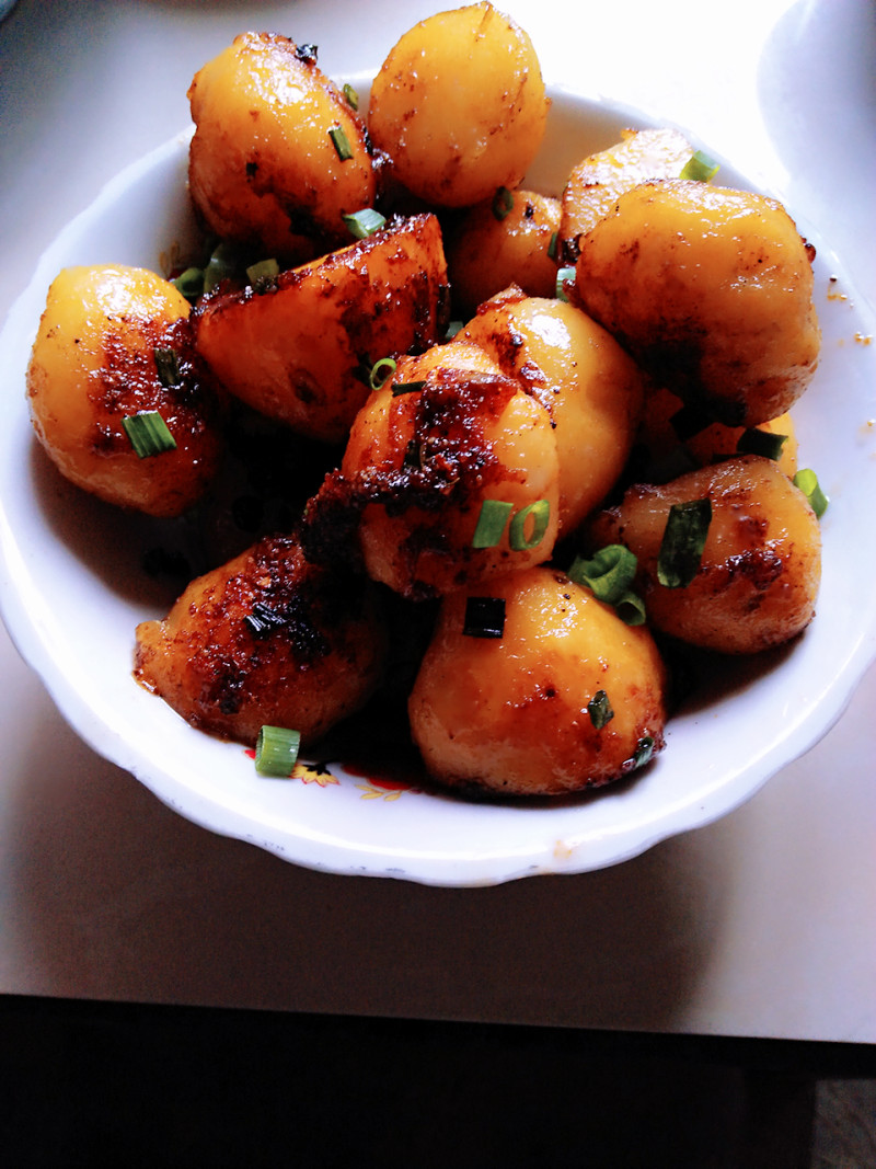 1:小土豆煮熟,去皮,准备葱花,糖,油