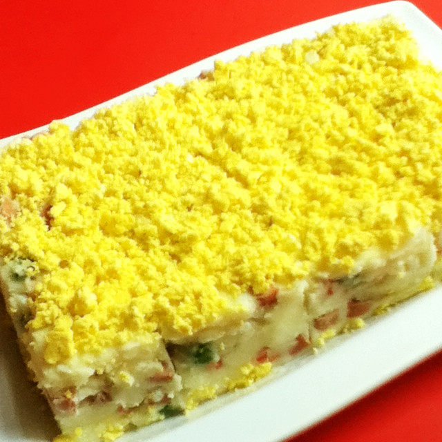 11:最后将之前准备好的蛋黄,匀匀的洒在土豆泥表面完成。