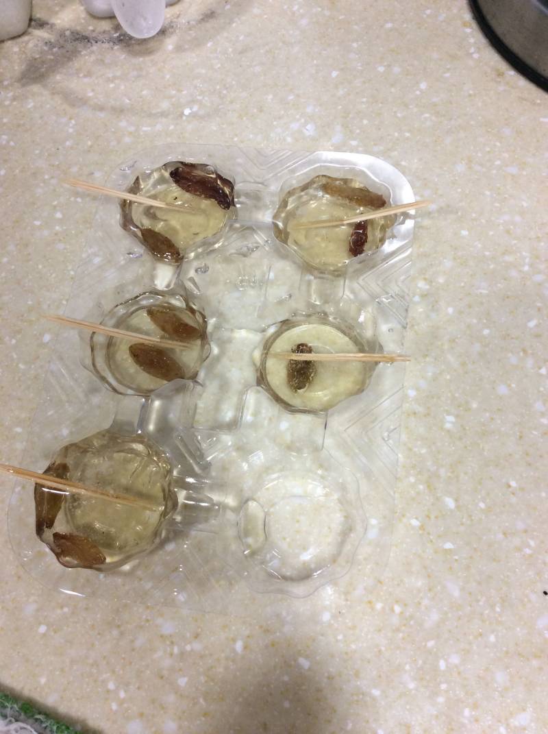 2:将模具抹上一层油,把提子放在模具里,用牙签固定在模具上