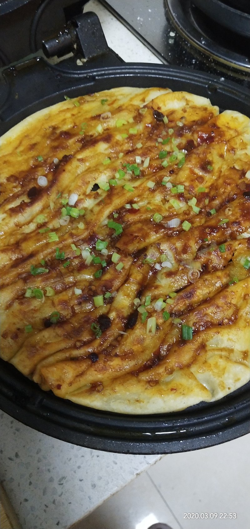 6:电饼铛倒入适量油,放入面饼,烙至一面焦黄后翻面,待另一面也烙的差不多的时候涂抹上酱料,撒上葱花和白芝麻即可出锅。