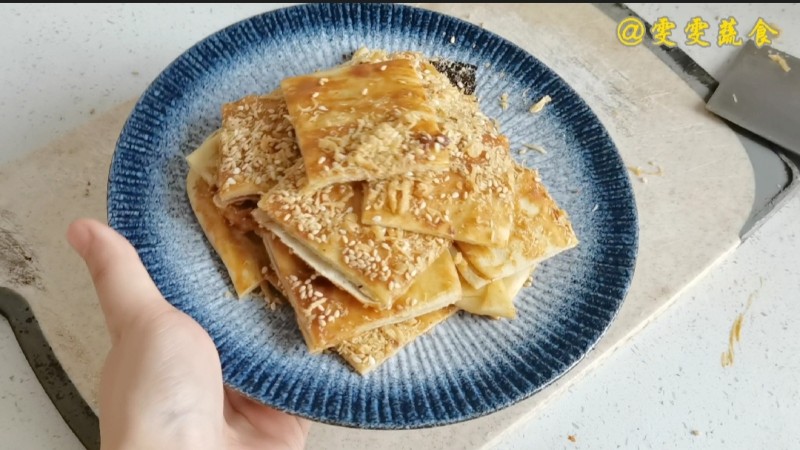 9:取出后,先切成长条,再叠起来,切小块,酱香饼完成!