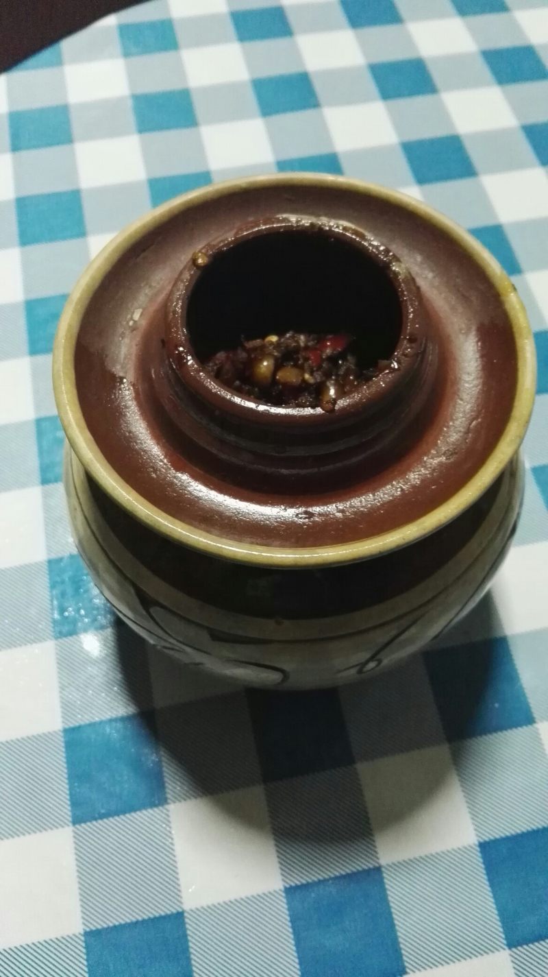 7:把锅中的辣椒的水煮一煮,加酱、米醋、米醋、白酒、冰糖、熬一熬把冰糖熬化。最后放盐,味精、蒜泥。(蒜泥不能沾水)稍微一熬就好了。