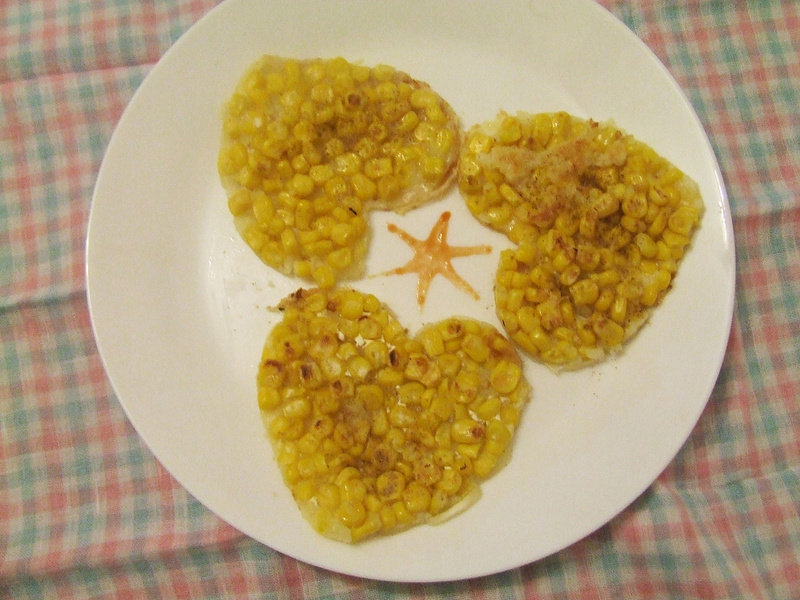 5:平底锅加热,放上心型模具,然后倒入适量色拉油,油热倒入拌好的玉米糊。
