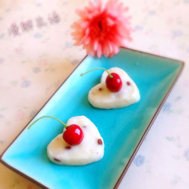 3:用些心形的硅胶模具或者是果冻壳来塑形,将山药泥压结实后倒扣在盘子里就可以了。