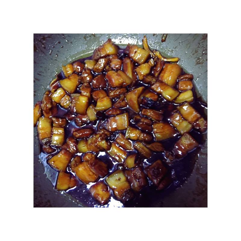 5:加入老抽把之前的葱段挑出来煮焖放料酒放姜片并且洒上冰糖