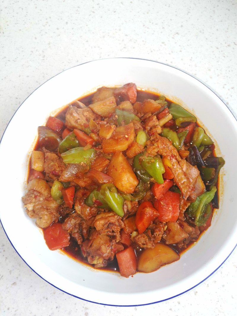 1:柴鸡洗净去除内脏切块,葱姜洋葱土豆柿子椒胡萝卜准备,柿子椒洗干净去蒂切块,土豆胡萝卜洗干净去皮切块,洋葱切小块。