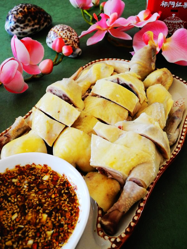 在煮鸡的过程中要几次控净鸡肚子里的水,为的是使鸡肉受热均匀。胖子的做法不一定正宗,但是味道还不错。蘸料可以依照个人口味调制。