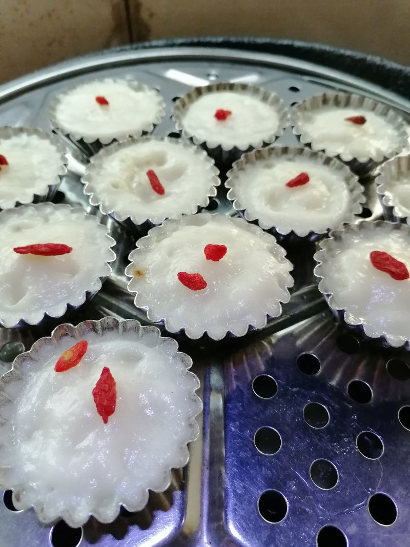 2:锅里水烧开,把米糊装模具里。放入葡萄干。放锅里大火蒸15分钟。
