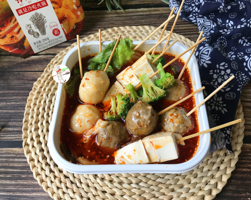 1:备好食材和钵钵鸡调料,火锅丸子提前从冰箱里取出化冻。