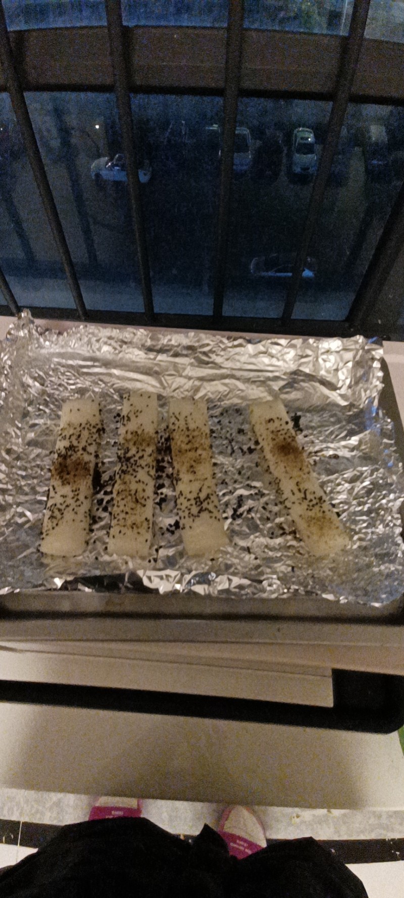 2:年糕沥干水,放在锡纸上。撒点盐和孜然粉和油和黑芝麻。