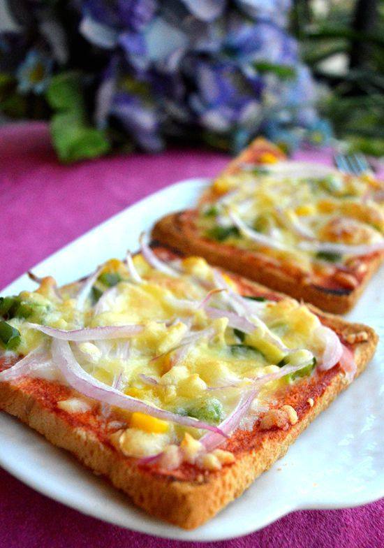 吐司2块;洋葱45g;灯笼椒50g;玉米粒30g;拉丝奶酪50g;番茄酱2汤匙;