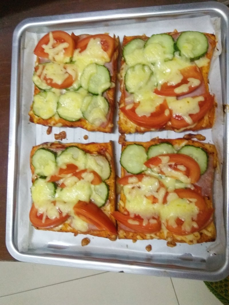 2:切菜的步骤忘了拍照了......将青椒,甜椒,黄瓜切粒,吐司片均匀抹上番茄酱,均匀铺上适量芝士条,再均匀铺上适量蔬菜和披萨切片(圆形薄肉片),最后再铺上适量芝士条。