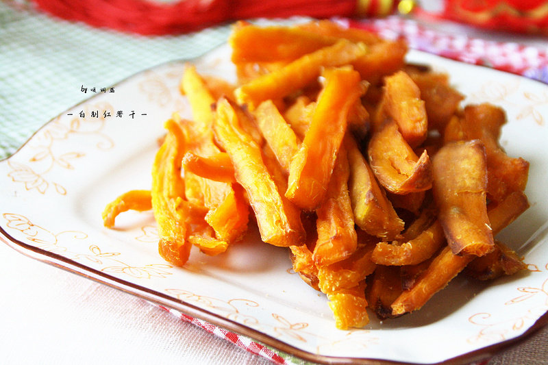 7:微波炉版:将红薯条平铺在有网孔,可以放进微波炉的容器上,中高火加热。每次加热时间大约2~3分钟,加热完成后,取出稍稍放凉,再继续加热。大约3次后,转为每次加热1分钟,注意观察,达到自己喜欢的干燥程度即可;烤箱版:将红薯条平铺在可以放进烤箱的容器上,放入烤箱中层,上下火,160度~170度,烘烤20分钟左右。取出翻面后,再继续烘烤5~10分钟;